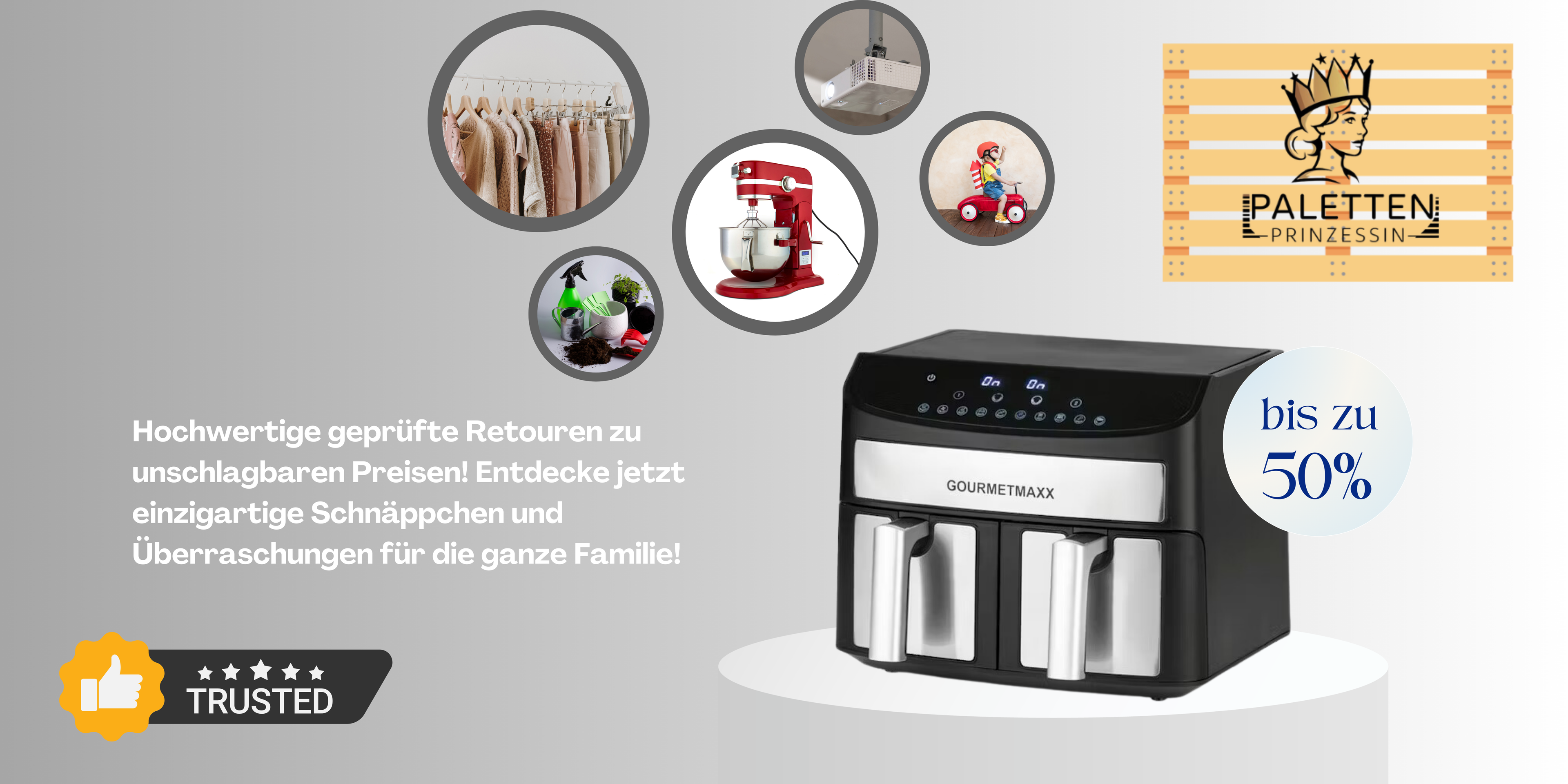 Paletten Prinzessin steht für Nachhaltigkeit, Qualität und Freude. Wir wollen Retourenware eine zweite Chance geben und gleichzeitig dir großartige Produkte zu unschlagbaren Preisen bieten. Gemeinsam machen wir das Shoppen nachhaltiger!